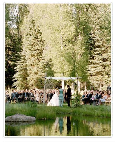 Today's real wedding come to us via Martha Stewart Weddings. This wonderful wedding took place in Jackson, Wyoming with tons of fresh outdoor decor ideas and wonderful all around wedding fun. One of the coolest ideas I think from this wedding is in the welcome bag the couple had made a donation in each guest name to save one acre of the rainforest- the idea of this was to help offset the carbon footprint of their own wedding.